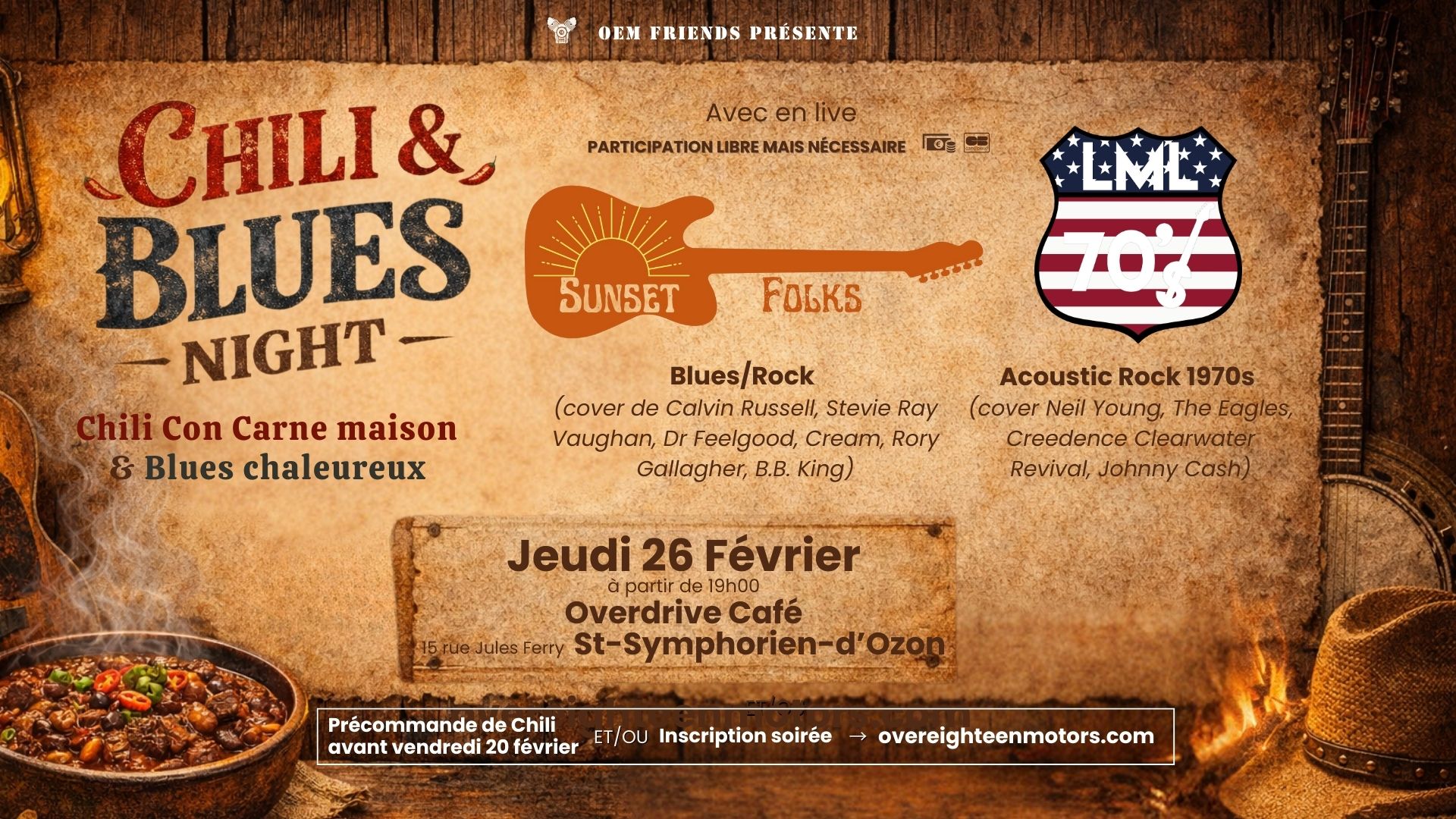 L’association OEM FRIENDS t’invite à l’Overdrive Café à une Chili Blues Night :