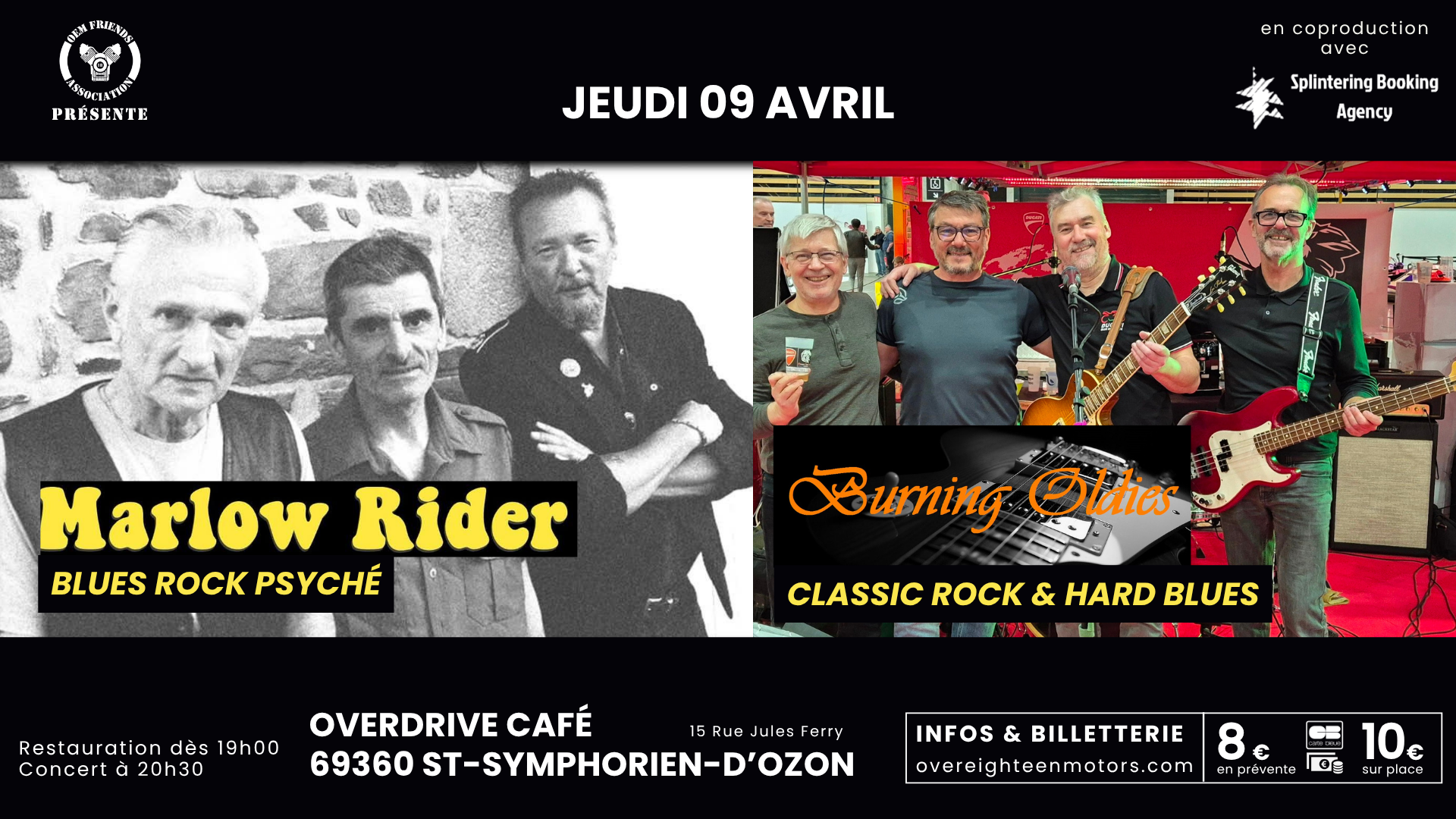 Concert blues rock avec Marlow Rider (compos) + Burning Oldies (reprises).