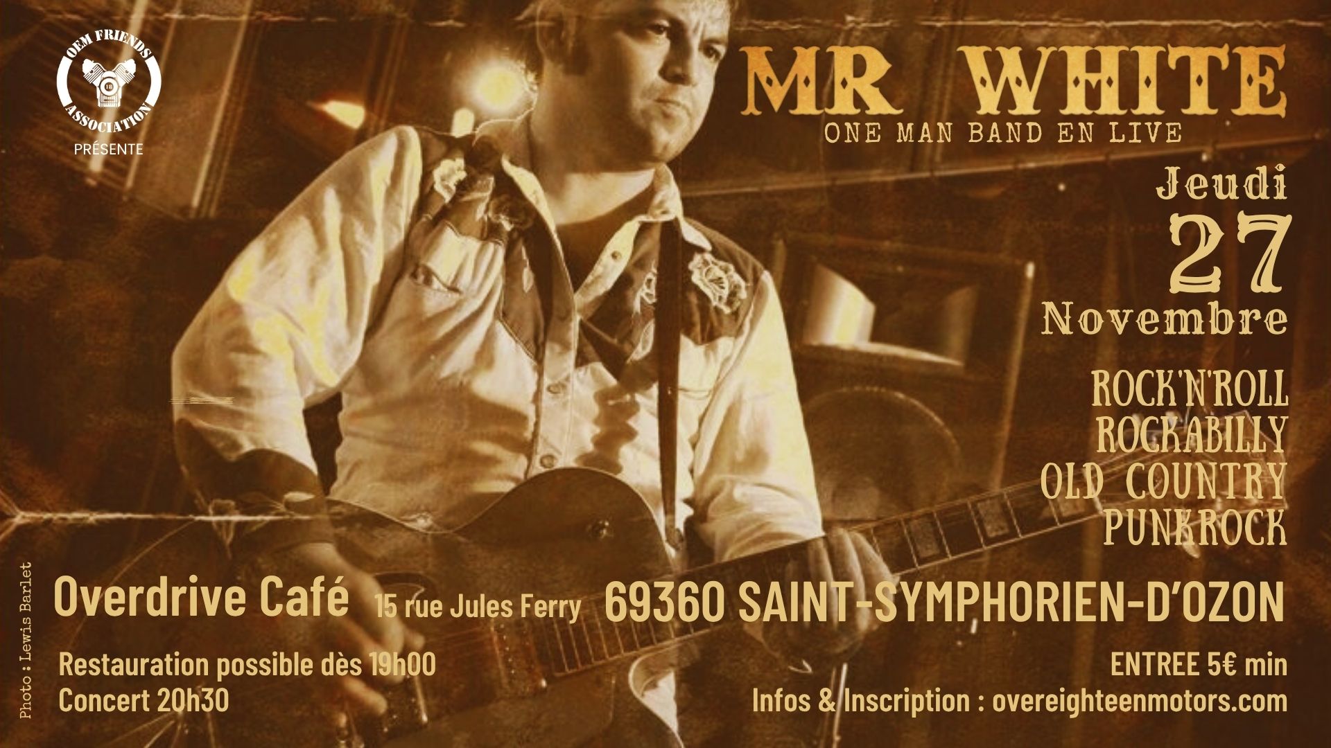 C’est depuis Avril 2008 que Mr White qui pratique le Rock’n’roll depuis plus de 25 ans maintenant se lance dans une nouvelle aventure en solo. Muni de sa légendaire guitare Gretsch Orange, sa voix et rythme au pied, il arrive pour délivrer la fièvre du vrai Rock’n’roll. L’accueil du public étant très positif c’est avec acharnement et passion, visible à la vie comme à la scène, que Mr White arpente désormais les routes pour des concerts très « Rock’n’roll », le répertoire allant du Rockab’ des années 50 jusqu’au Punkrock 77 ! Plusieurs compositions se glissent dans ce répertoire … Il totalise + de 1350 concerts et 5 albums !