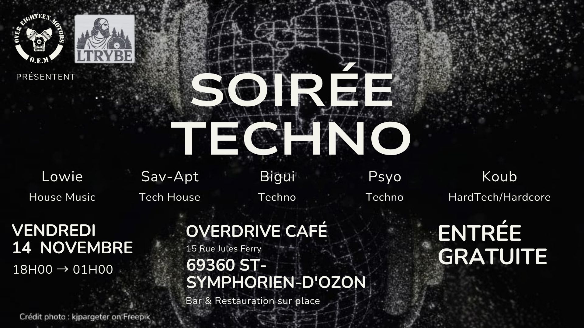 Over Eighteen Motors et Lugdunum Trybe [chaîne Youtube] organisent une soirée techno à l’Overdrive Café.